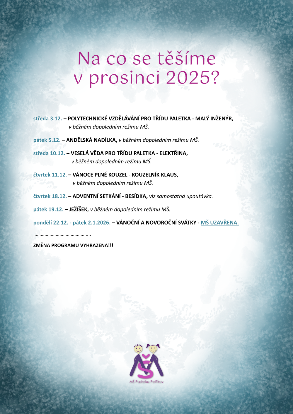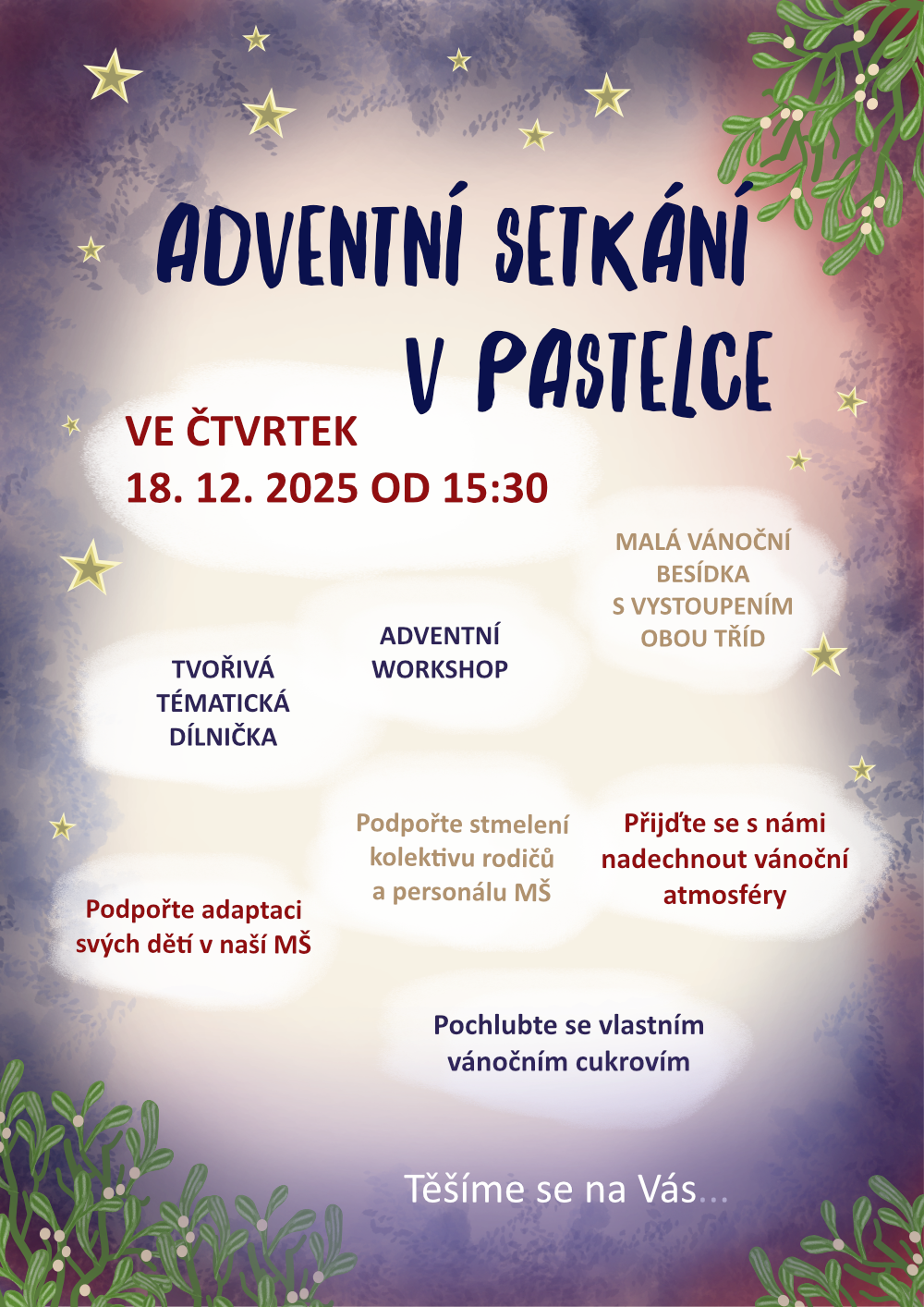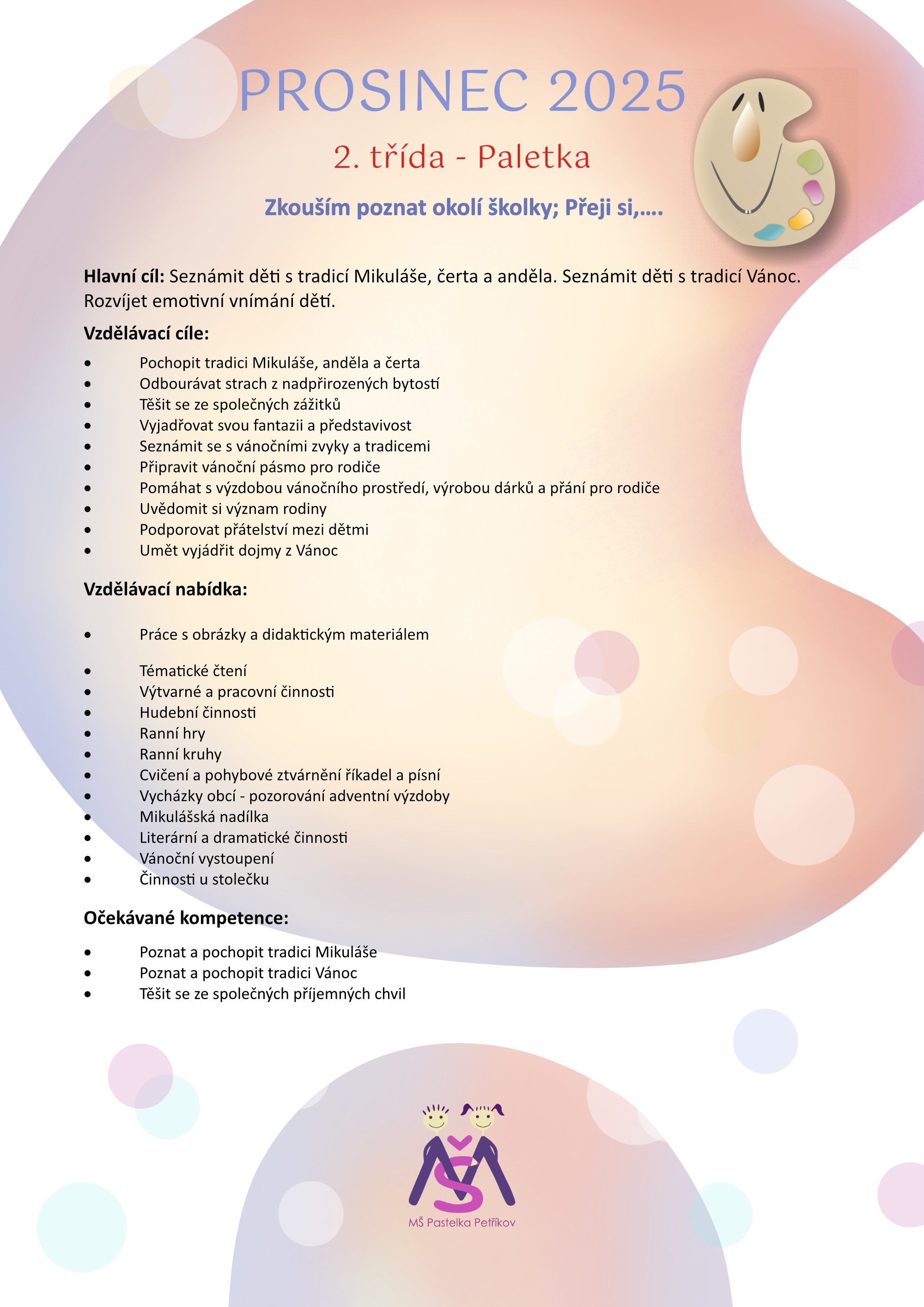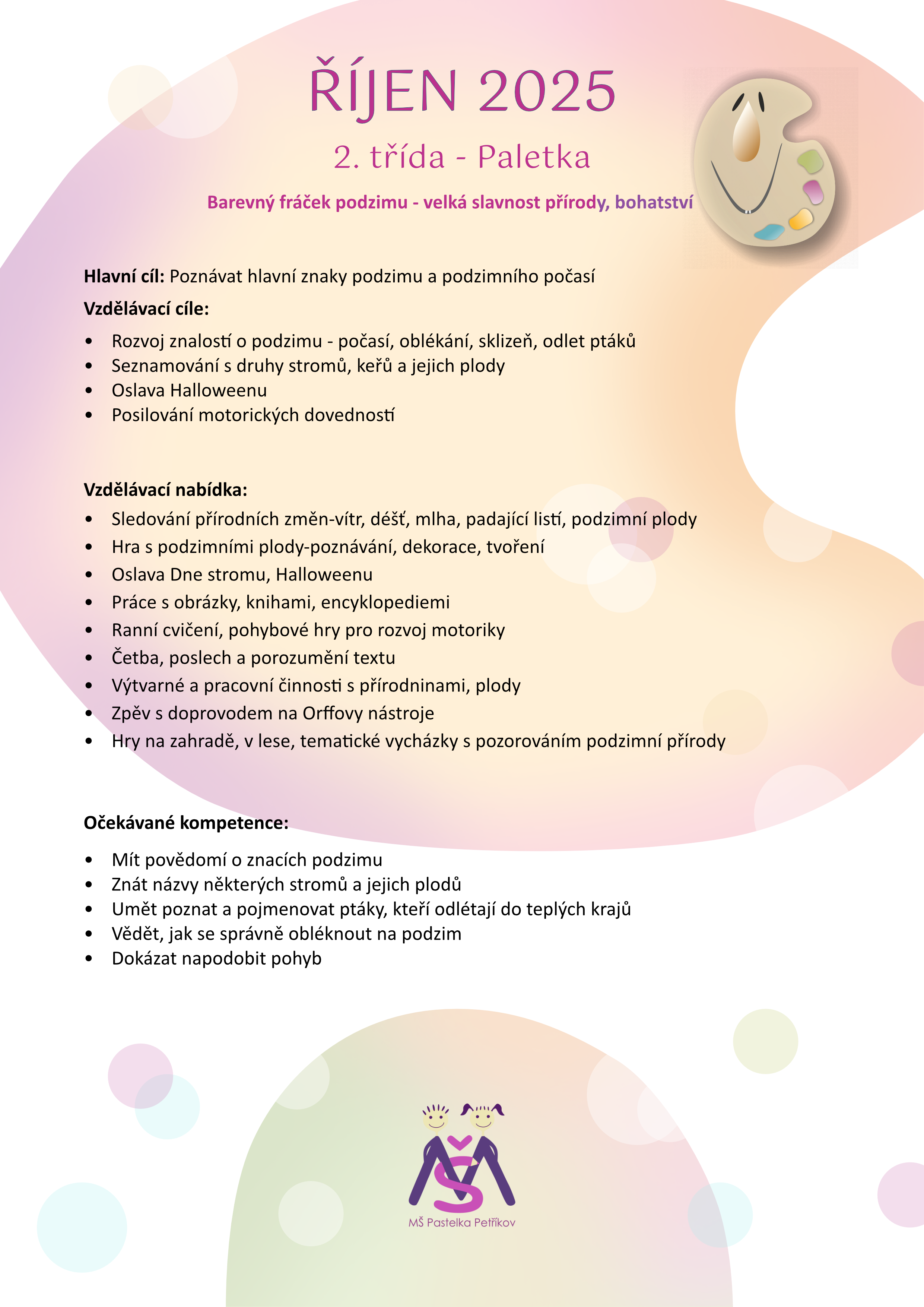 Na všechny děti se moc těšíme a doufáme, že spolu s naším mottem: „Pastelka mi pomůže, abych to dokázal sám.“ vytvoříme dětem druhý domov, kam se budou těšit a odkud nebudou chtít odcházet, kde se budou cítit šťastní, jistí a v bezpečí a pro Vás rodiče prostředí vzájemné důvěry, sdílení, porozumění a spolupráce.