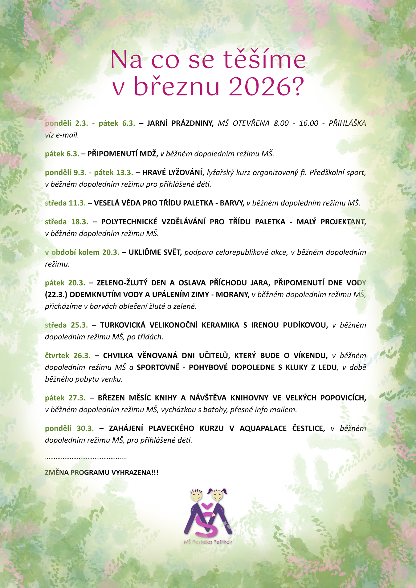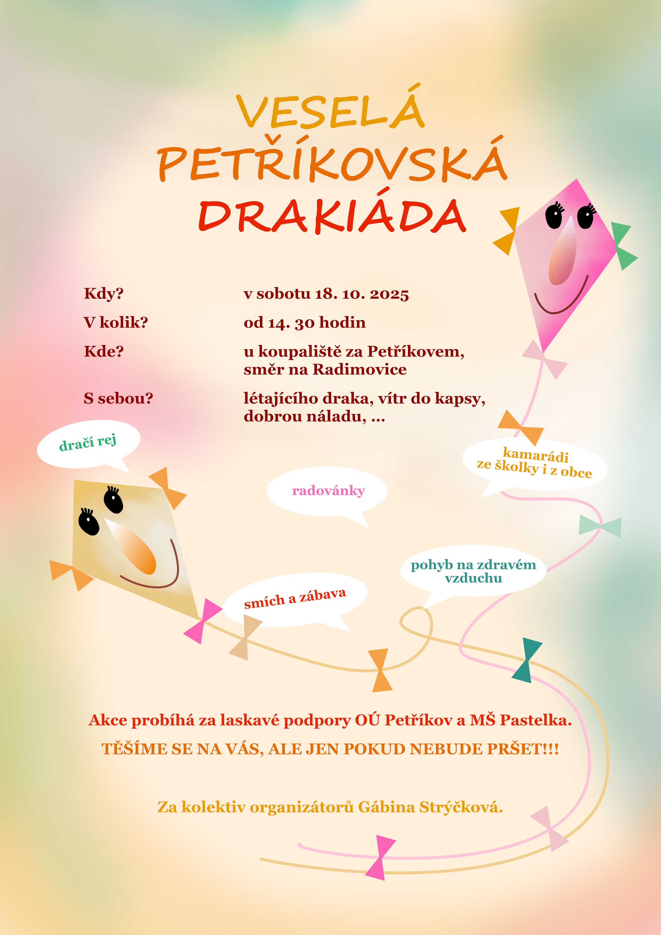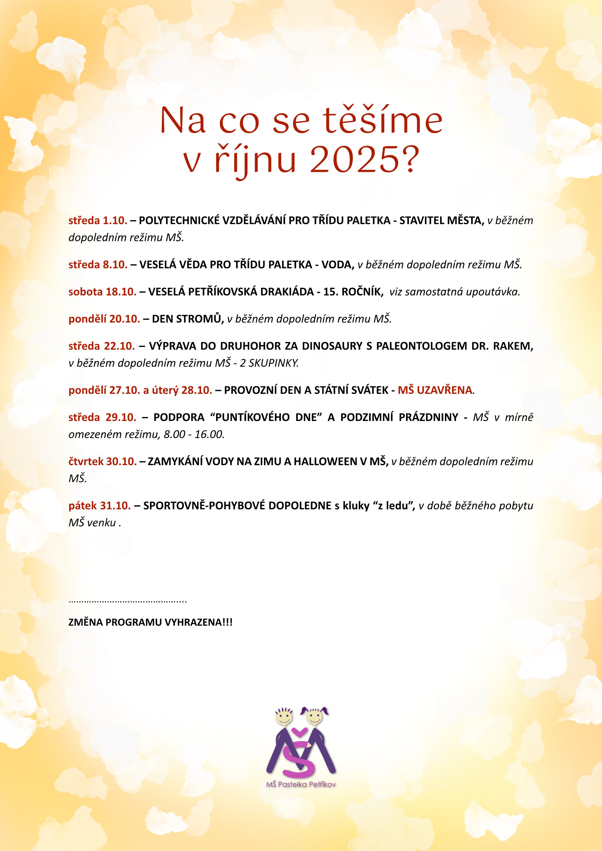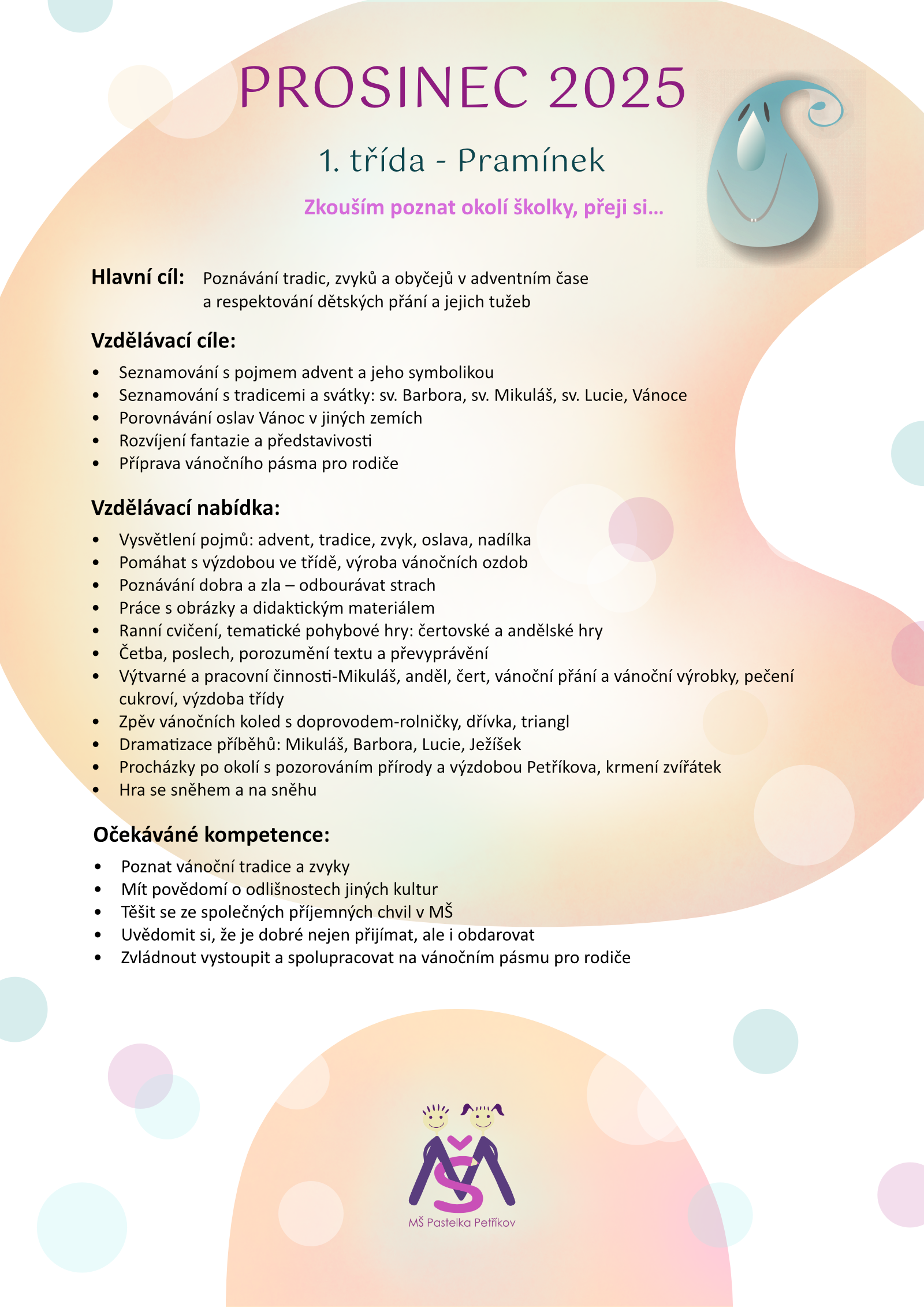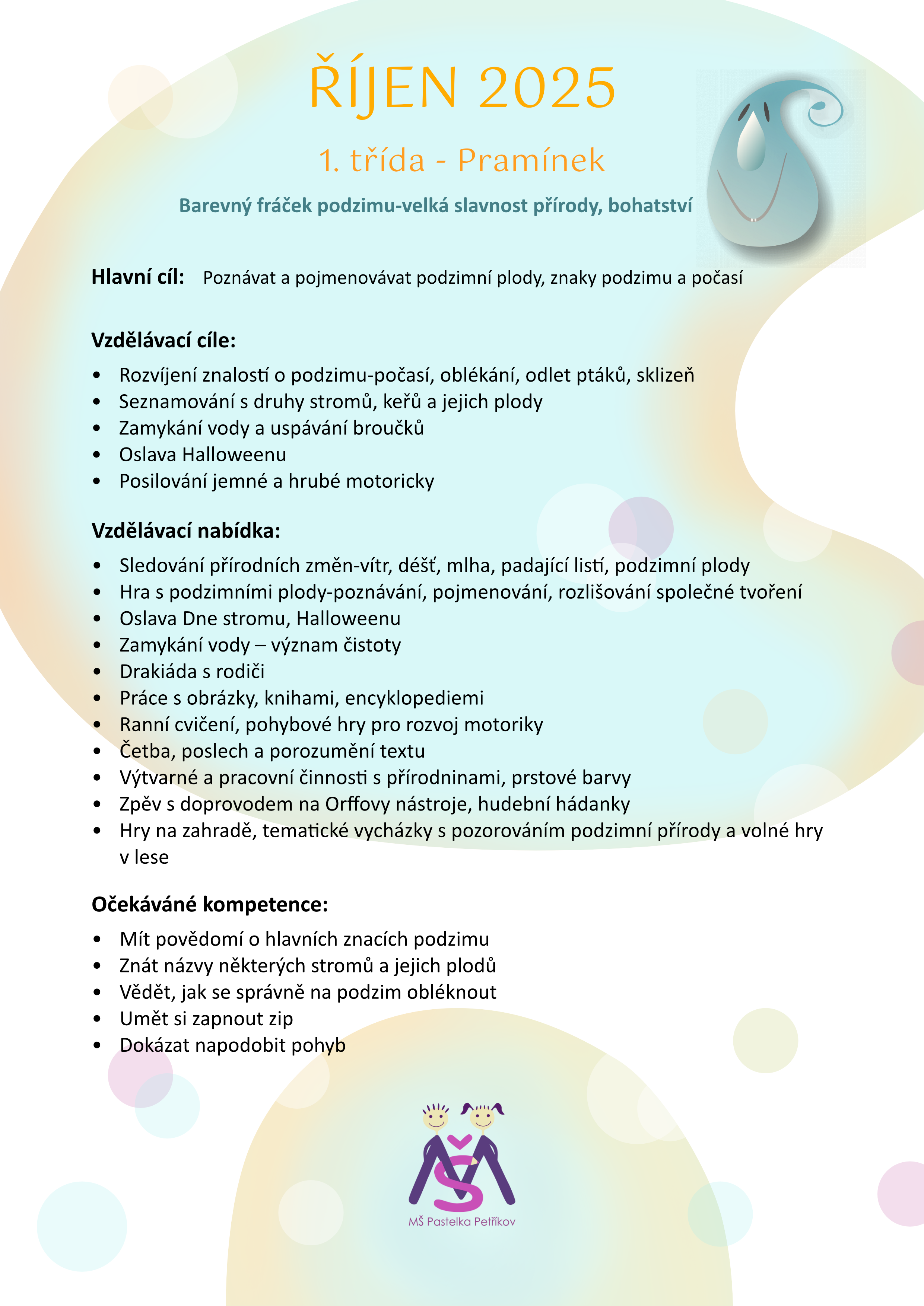 Na všechny děti se moc těšíme a doufáme, že spolu s naším mottem: „Pastelka mi pomůže, abych to dokázal sám.“ vytvoříme dětem druhý domov, kam se budou těšit a odkud nebudou chtít odcházet, kde se budou cítit šťastní, jistí a v bezpečí a pro Vás rodiče prostředí vzájemné důvěry, sdílení, porozumění a spolupráce.